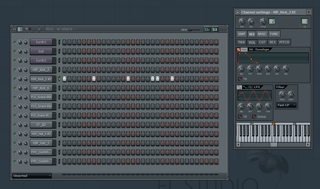 Also, a real hi-hat will decay more quickly when you hit it softly. We can replicate this by copying the first hihat channel and adjusting the decay of the volume envelope. We’ll use the original channel for the harder hits, and the new one for softer hits:
